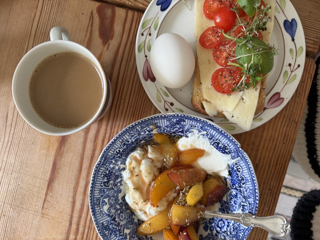 Åt en favoritfrukost och introducerade gänget till den lilla skålen nederst i bild. Stekta nektariner karamelliserade i honung och rosmarin. Började med detta som en sommarfrukost för två år sedan och inte kunnat släppa den sedan dess. Det vita kladdiga under är inte glass, utan turkisk yoghurt. Eller grekisk. Vilken man nu föredrar.