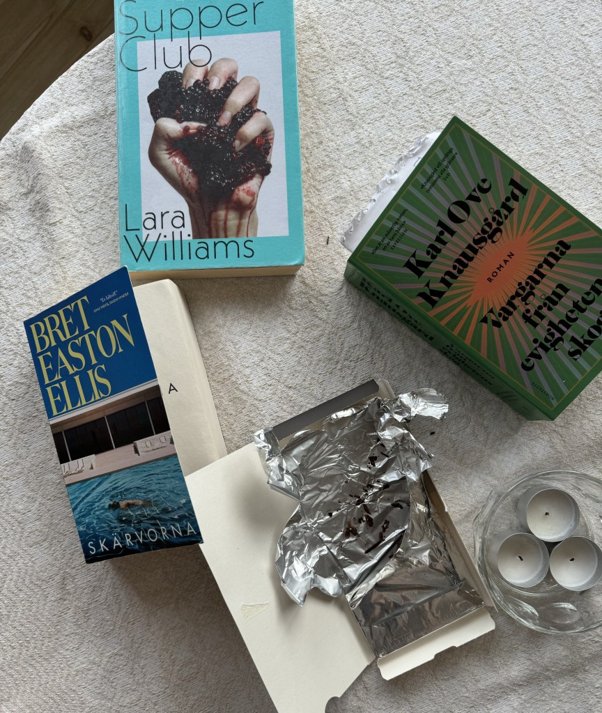 Mest var det dock inte sol om man nu ska vara helt ärlig, utan regnet gjorde sig påmint med jämna mellanrum och ”omväxlande molnighet” känns som väderprognosens främst förekommande gissning under veckan. Var dock mysigt att bara vara samlade, och dåligt väder kan hjälpa till med fler gemensamma lässtunder än vad man hade unnat sig annars. Här ovan har ni mina kompisars bokval under veckan. Har själv bara läst Skärvorna, men är rysligt sugen på Supper Club. Minns när den kom ut 2019 och hur den hyllades då. Den känns dekadent, ett tema som jag ofta kan uppskatta.