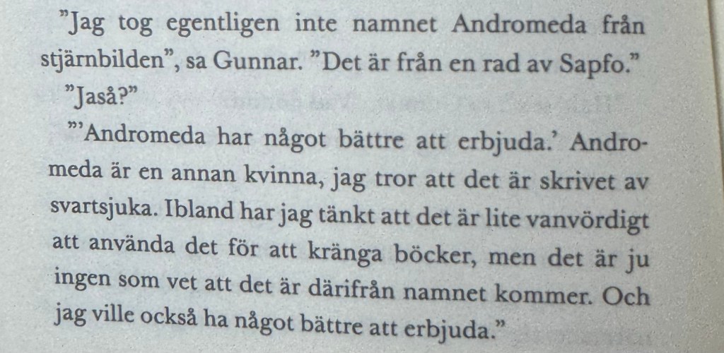 Det finns vissa teman i böcker som jag dras till. Om jag vet att boken handlar om skrivande, bokhandlar, förlagsvärlden, författarskap, då kan jag inte låta bli att tillsist läsa den. Therese Boman har skrivit boken Andromeda som jag fick höra handlar om just förlagsvärlden. Nu när jag själv har läst den tycker jag egentligen mest att den handlar om relationer som aldrig blir benämnda och kittlingen i den. Fast kanske också om litteratur och vad det kan få en att känna. Titeln, Andromeda, är förresten tagen från Sapfo som jag skriver om här.