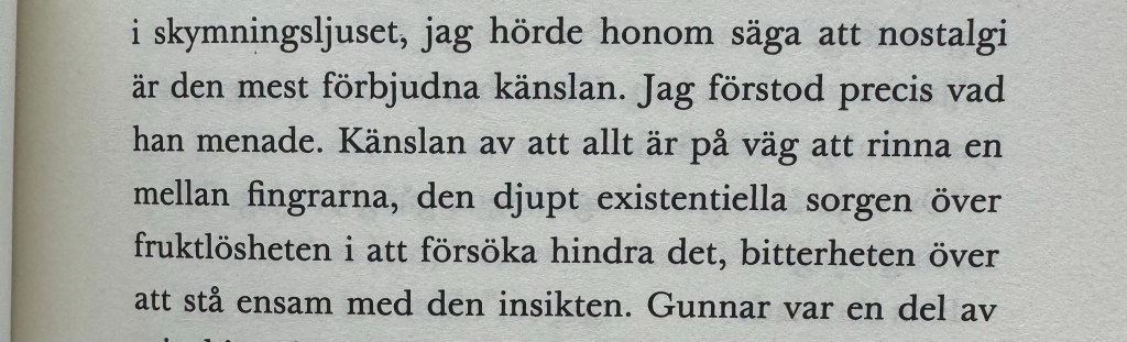 Trots det grät jag en skvätt, även om jag menar att jag inte riktigt fångades av det hela. Så det är ju motsägelsefullt. Det förstår jag. Kanske var vissa drag i Gunnar som jag så starkt kände igen mig i som trots allt tog.