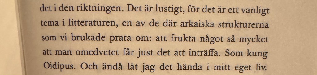 Boken gick snabbt att läsa, orden rann förbi men det är inte den enda kvaliteten som avgör om en bok är bra eller inte, tyvärr. Jag uppskattade att boken hade ett litterärt tema. Jag kan känna igen mig ingen av huvudpersonerna Gunnar som tycker annat om litteraturen, kanske kallas han mossig men han har sådana poänger att jag själv känner mig som en 70-åring man. Den andra huvudpersonen är ung, den är hennes perspektiv vi följer först, om hur hon otippat nog får en plats på ett förlag och höjs av Gunnar fastän hon inte visat sina armbågar än. Just deras relation är det stora temat – vänskap över makt, ålder och könsgränser. Ligger det alltid ett sexuellt korn i en sådan relation eller kan man bara ha ett utbyte utan romantik? Jag tycker just denna del beskrivs väl och värdigt. Tanken måste passera för båda, men vad man gör av en sådan tanke är vad som avgör.