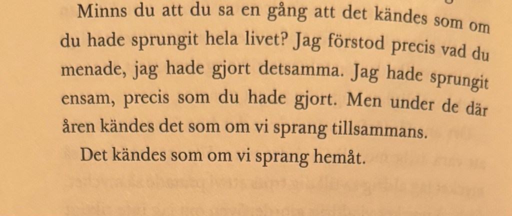 Kanske är det jag-perspektivet? Det är ett klurigt perspektiv att skriva ifrån och svårt att behärska, men gör man det, då är det ett otroligt grepp att ha kring läsaren. Sitter inte jag-perspektivet helt kan det bli alienerande och lite tomt? Och det kanske just är det sistnämnda jag känner av. Önskar en fyllighet i berättelsen som man inte kan nå med det perspektiv som ges. Egentligen är det samma berättelse som sägs ur varsitt perspektiv, så det är inte alltifrån många sidor som är just historien. Sofie berättar sin del av historien, sen läser vi Gunnars tankar kring samma tidsperiod. Kanske hade jag känt annorlunda om jag läste boken mer som en lång novell och inte en bok, kanske hade den känts fyllig nog då.