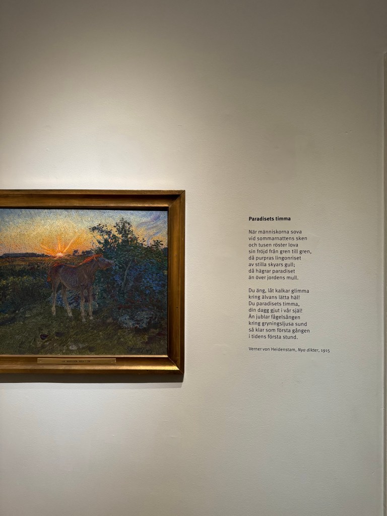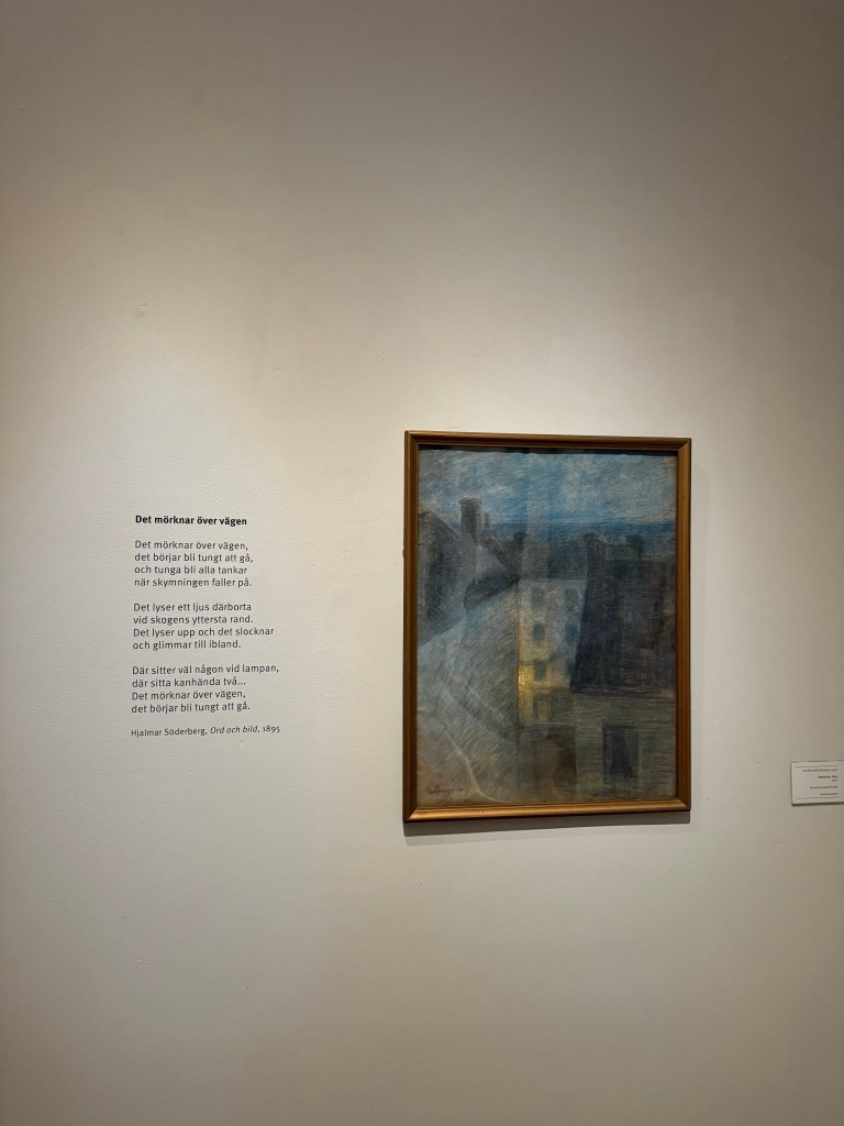 Jag älskar skymning. Jag älskar soluppgång. Jag älskar solnedgång. Jag älskar gryningen. Och jag älskade den här utställningen. Dels fick man ta den av vackra konstverk på temat, men blandat med dikter som gav en särskild stämning till rummet. Hela utställningen är uppkallad efter Pär Lagerkvists dikt.