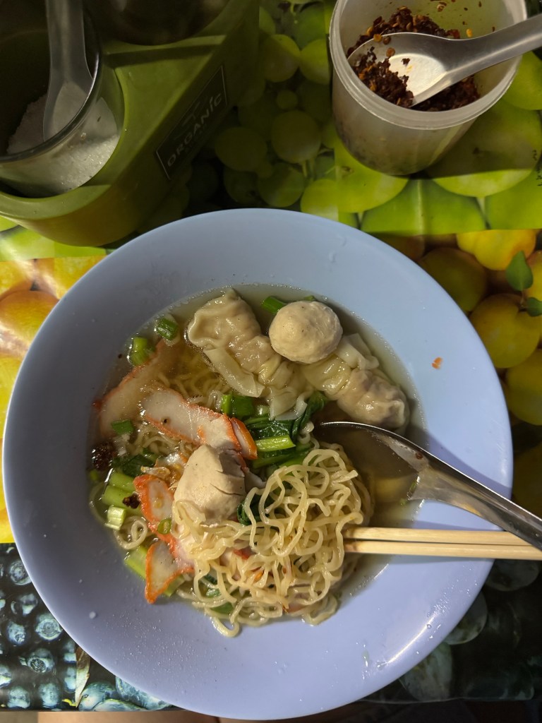 Jag vet inte exakt vad vi åt men någon boll med fläskfärs? Kyckling? En tunn klar buljong och goda nudlar. Strösslade på lite jordnötter och chili från karen på borden, och slurpade i oss. Soppan var okej men upplevelsen var tio av tio.