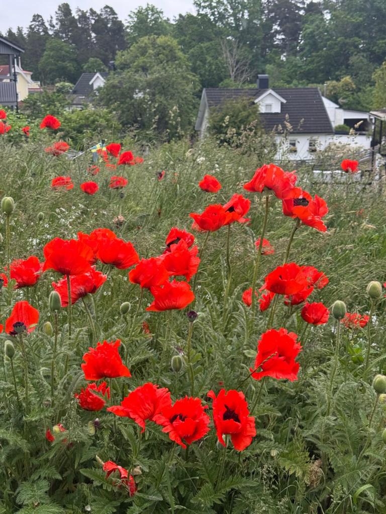Vallmon stod friskt utslagen i backen. Den lös så starkt, bilden är inte redigerad när det gäller mättnad utan det stack i ögonen när man kisade mot den röda färgen.