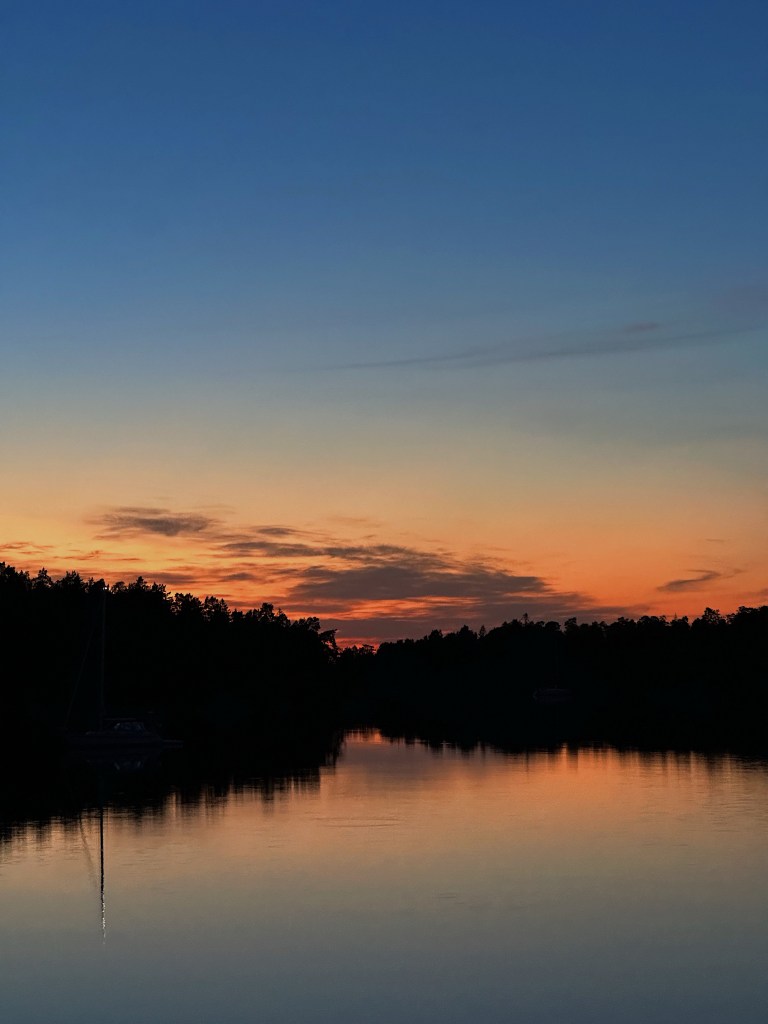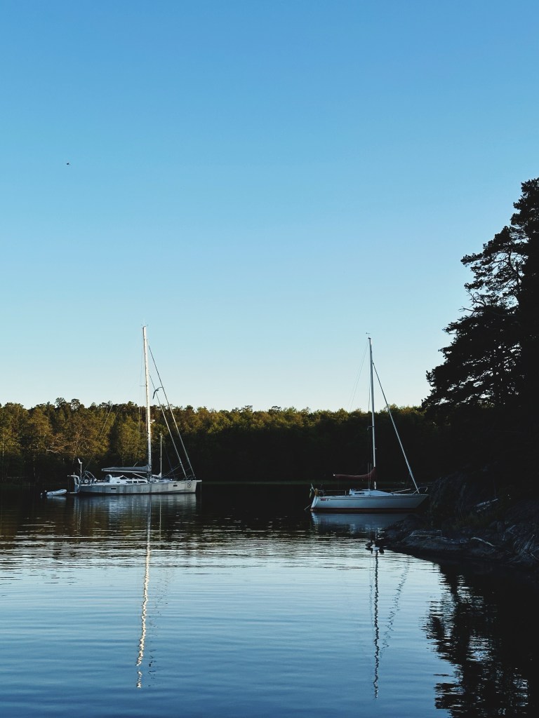 Det var fasligt vackert här och morgonen efter ville man bara dröja sig kvar men plötsligt insåg vi – Linns tåg tillbaka till Skåne behöver ju matchas med någon hamn! Vi bestämde oss för att sätta kurs mot Stavsnäs och det var ruskigt bråttom där ett tag, så dumt när man ju egentligen förlitar sig på naturens krafter, och naturen vet man ju inte vad den vill ge.