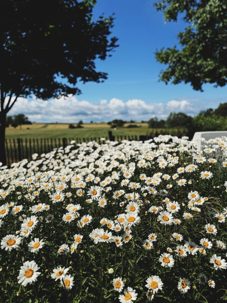Vår första anhalt var också det egentliga målet för dagen. Jag tillbringade en del av mina sommardagar som barn i Borrby, hos Gertie och Evert som agerade lite extramor- och farföräldrar när jag hade mina egna så långt bort. Det var säkert bara en handfull gånger men i ett barnaminne är det mer än så. Det var något särskilt att få åka iväg ett par dagar utan mina egna föräldrar och få vara ompysslad där ute. Tiden går och jag kan inte förstå att Gertie är 85, och att Evert inte finns kvar i livet. Platsen är sig lik och Gertie likaså. Vi åt lunch och fikade efterrätt, pratade minnen och nutid. Min själ var så varm efter. Det här prästkragehavet ovan är från trädgården, och just det fanns inte när jag var barn men klädde trädgården otroligt.