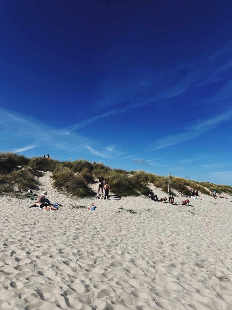”Nu får du visa din påg Skåne och vårt Österlen!” sa Gertie när vi åkte. Hon är uppvuxen ganska nära Borrby och hennes ord tog jag på fullaste allvar, så först åkte vi ner till Sandhammaren för ett dopp. Stranden här är magisk, otrolig sand och väldigt bred. Liknar Ljunghusens strand! Men det kan bli väldigt fullt, dock var vi framme sent en blåsig eftermiddag så plats fick vi. Det var Daniels första gång på Österlen.