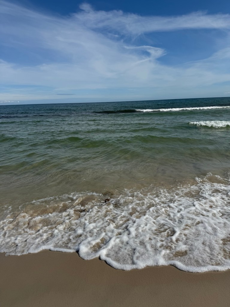 Skummande hav, så rofyllt. Vi badade, men det var ruskigt kallt fortfarande, kanske 15 grader? Jag tror inte det kan ha varit mer och i blåsten kändes det ännu snålare med graderna. Men vi klädde på oss snabbt och åkte vidare.