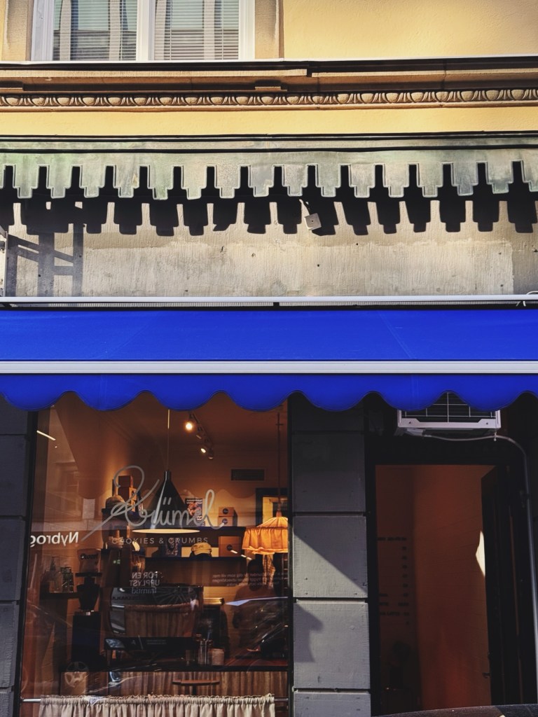 Gick förbi blått vatten och röda markiser. Drack te ur min mycket bekväma mugg, den känns som en take-away mugg och som 90-talist som växte upp med amerikanska serier där en kaffe i take-away kändes så urbant, så är detta drömmen. Min mugg var dock fylld av Sibyllans Sir Williams-te med en liten skvätt mjölk.