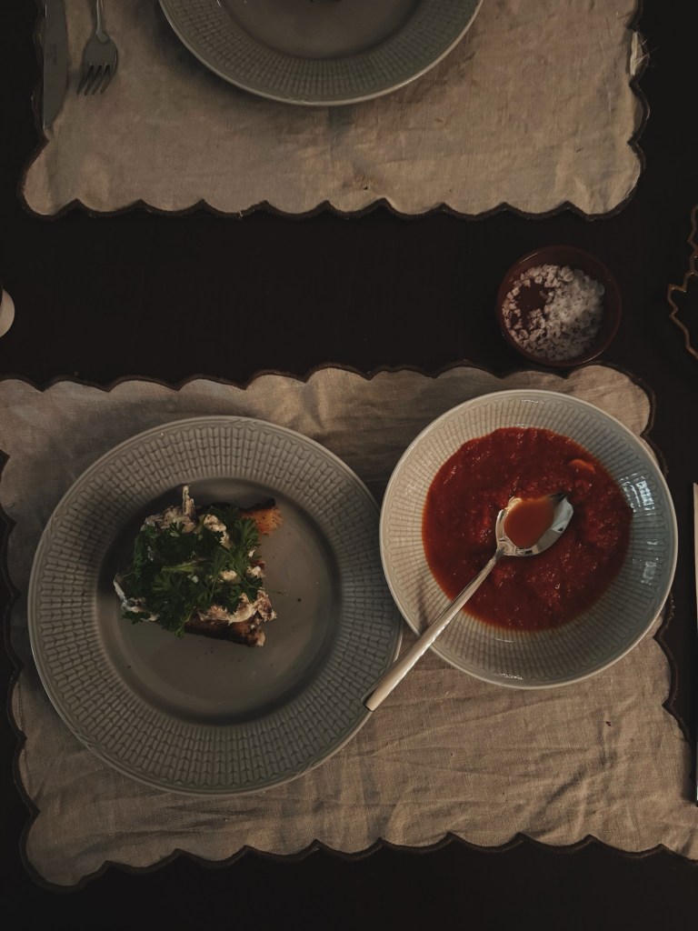 Och denna trötta bild får avsluta min vardag. Jag rostade förutom mandlar även tomater och gjorde en riktigt god tomatsoppa, och i brist på att hinna plocka svamp så köpte jag kantareller i butik och gjorde varsin macka till mig och Daniel.