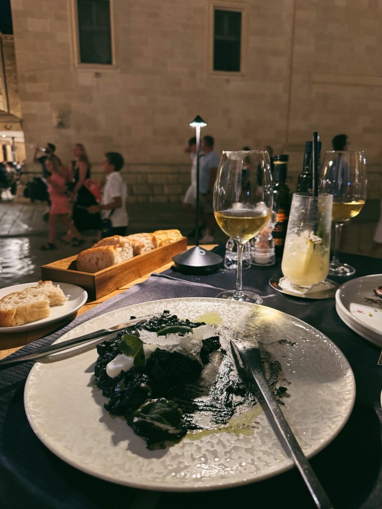 Första kvällen åt vi på en ljuvlig restaurang, typ en av de bästa under hela resan. Jag tog en Dalmatisk kulträtt, nämligen svart risotto som heter Crni Rižot på kroatiska. Denna var G A L E N. Så otroligt god! Bläckfisken i var perfekt konsistens, det svarta bläcket skapade massor av umami och sälta som bröts av med burrata och friterad salvia. Om jag åker tillbaka till Dubrovnik blir det exakt den rätten igen och igen, på exakt det stället.