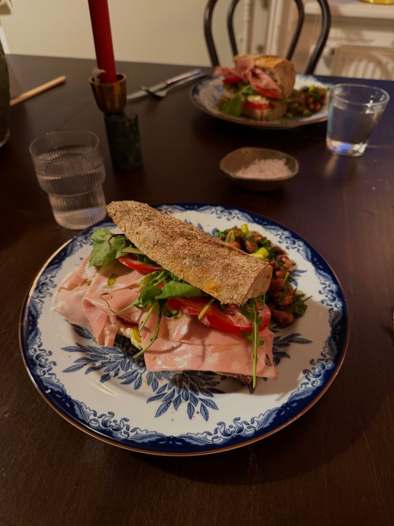 Sen drog vi runt på stan, gick på NK, kollade på en traktörpanna jag verkligen vill ha men som är alldeles för dyr osv. Väl hemma laddade vi upp med mortadellamackor. Baguette från Fabrique, pistagepesto, olivolja, mozzarella, tomater, pistage-mortadella, saltgurka, rucola. Ja det var fantastiska, lovar.