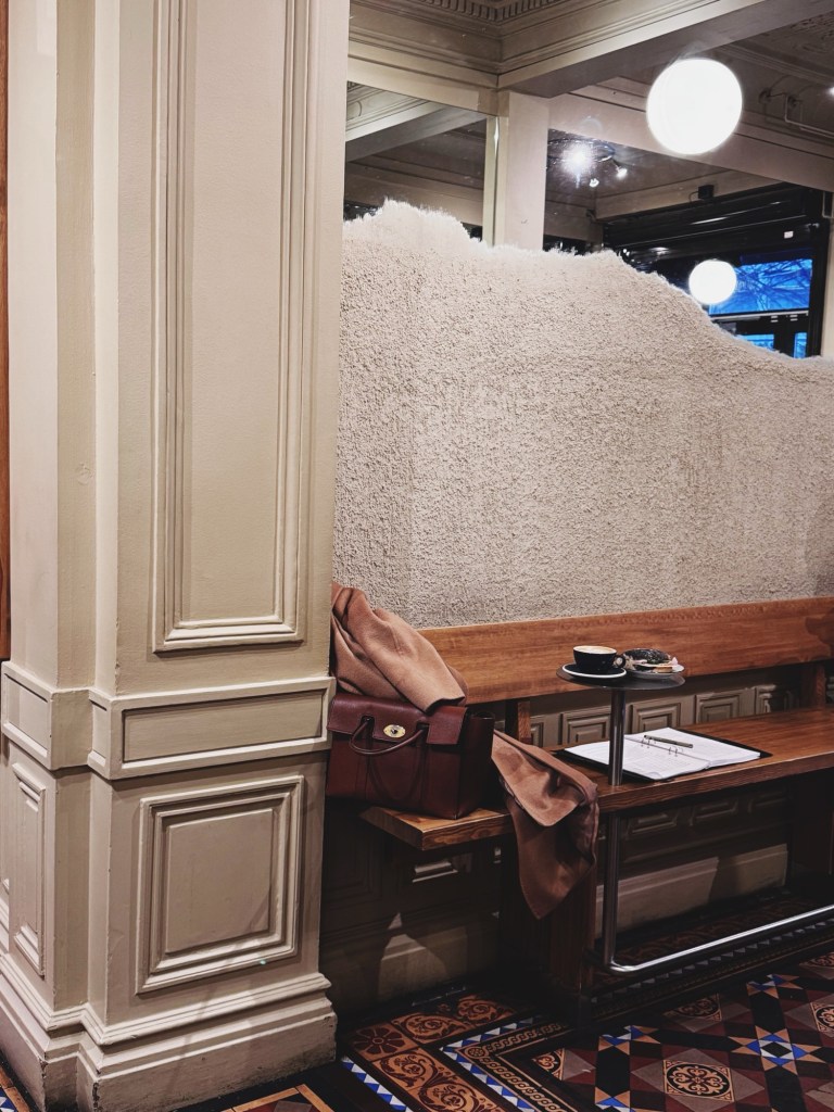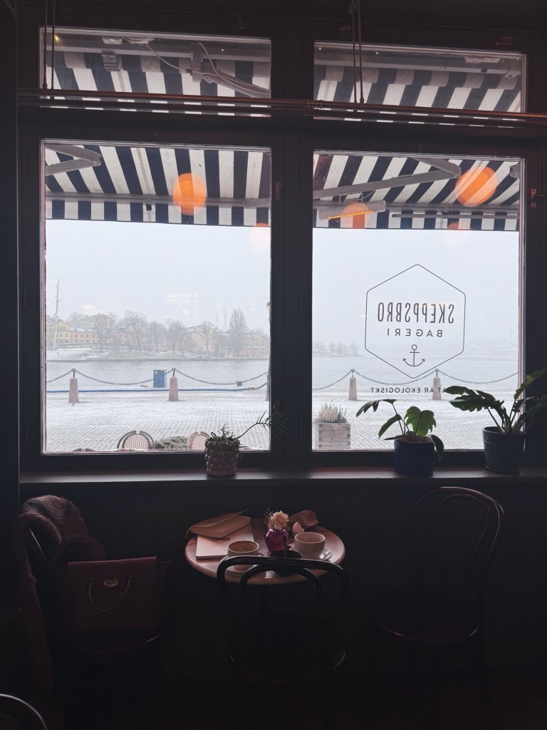 Jag hade kursdagar och en morgon mötte jag upp Matilda på Skeppsbro bageri. Jag var sen pga verkar vara det kroniskt, men vi fick en fin pratstund. Satt kvar lite efter och skrev dagbok. När jag kom ut regnade det slask i sidled vilket jag inte uppskattade.