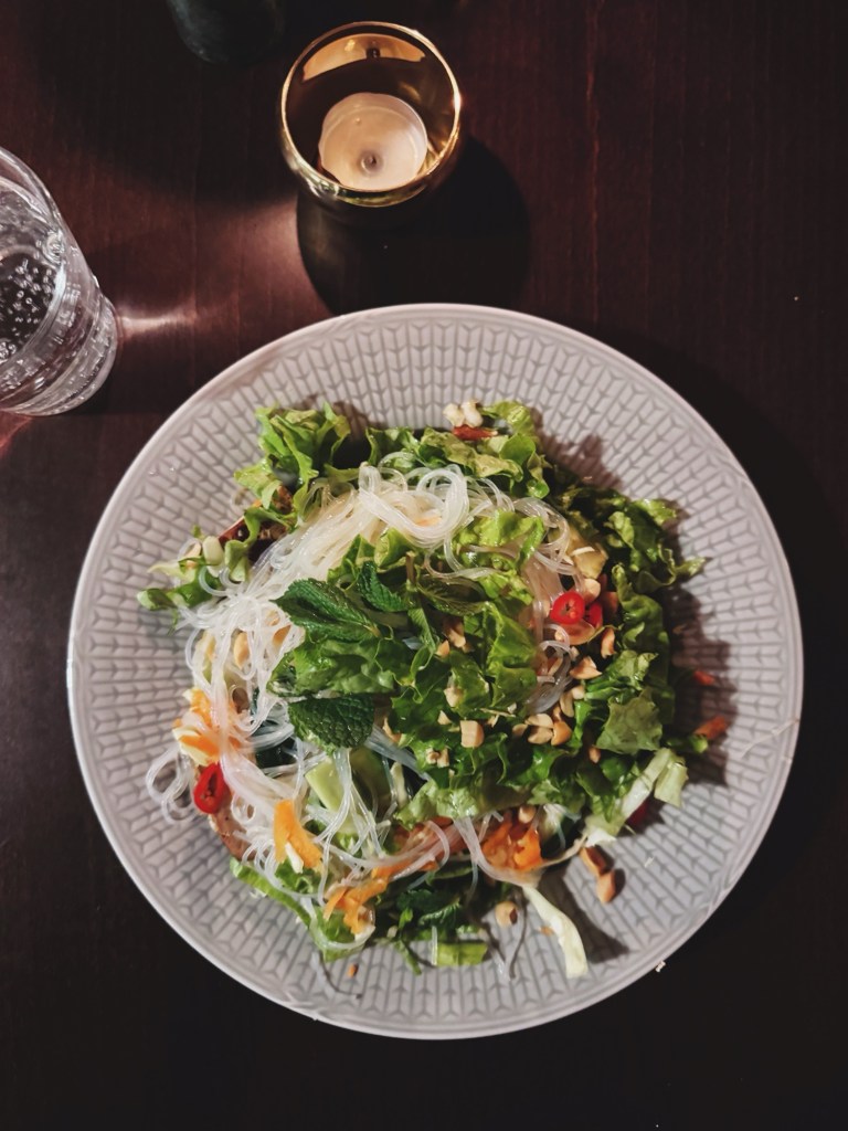 Den här nudelsalladen gör jag relativt ofta i lite olika tappningar. Jag älskar den vietnamesiska dressingen nuoc cham, den balanserar syrligt-salt-umami-sött på ett brutalt sätt. Här är det glasnudlar, blandade grönsaker, massor av färsk mynta, tofu och jordnötsströssel.