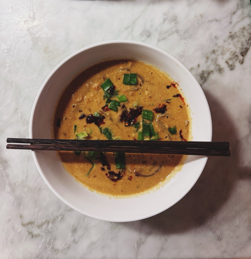 Jag gör sällan mat på recept men trillade förbi ett nudelsopperecept som såg gott ut på Instagram och följde instruktionerna till punkt och pricka. Man hade i allt som är gott: miso, jordnötssmör, chili crisp oil, sesampasta och redde av med kokosmjölk. I botten av den här skålen ligger soba-nudlar, inte ett riktigt soppval kanske men det var vad vi hade hemma. Detta blev gott men alldeles för mastigt och rikt för att fungera som soppa i min mening. Dessutom lite oklar smakprofil när allt blandas sådär, det tar ut varandra? Men det blev en vacker skål och konceptet nudelsoppa är ju en hemskt trevligt i vintertid.
